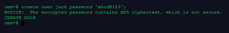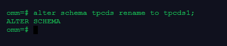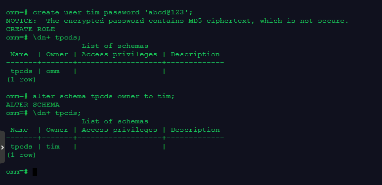 create user tim password 'abcd@123';\dn+ tpcds;alter schema tpcds owner to tim;\dn+ tpcds;