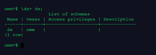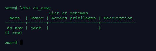 2.创建一个用户tim, 并将tpcds的owner修改为tim,且修改owner前后分别使用\dn+查看模式信息