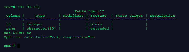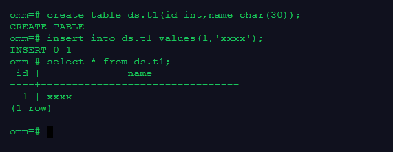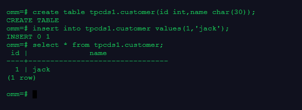 create table tpcds1.customer(id int,name char(30));insert into tpcds1.customer values(1,'jack');select * from tpcds1.customer;