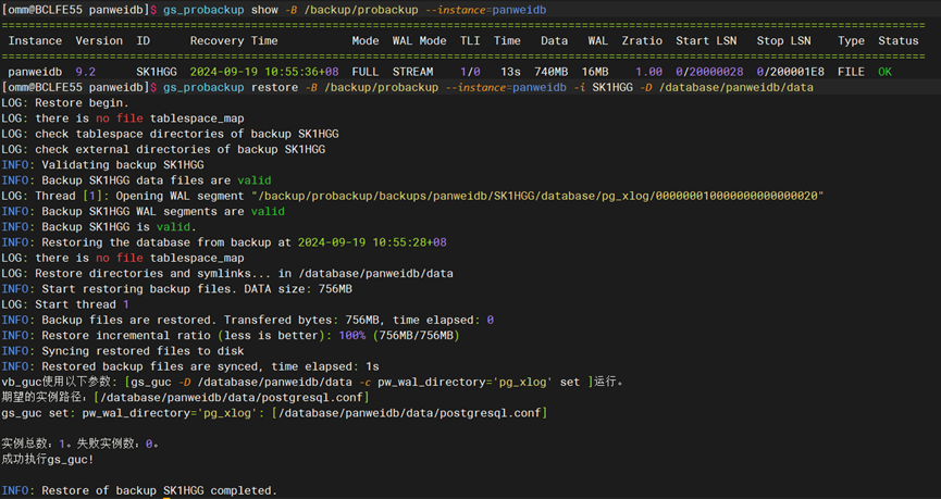 gs_probackup restore -B /backup/probackup --instance=panweidb -i SK1HGG -D /database/panweidb/data
