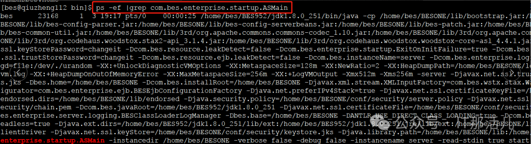 BES进程包含“com.bes.enterprise.startup.ASMain”信息,通过命令“ps -ef |grep com.bes.enterprise.startup.ASMain”。