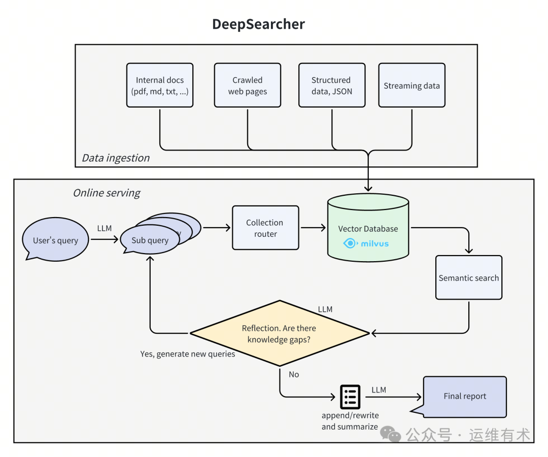 好消息是,向量数据库企业 Zilliz 给出了一个完美解决方案!他们基于 DeepSeek 等主流开源模型,对传统 RAG 方案进行了重大升级,推出了重磅开源项目 DeepSearcher。这个项目不仅完美继承了Deep Research 的核心理念,更支持企业级私有化部署!
