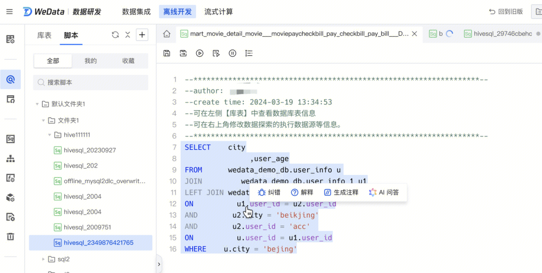 目前WeData AI助手功能已全面上线,您可登录WeData广州地域进行免费试用(点击阅读原文即可跳转),其他地域支持开白试用。即刻体验智能开发范式!