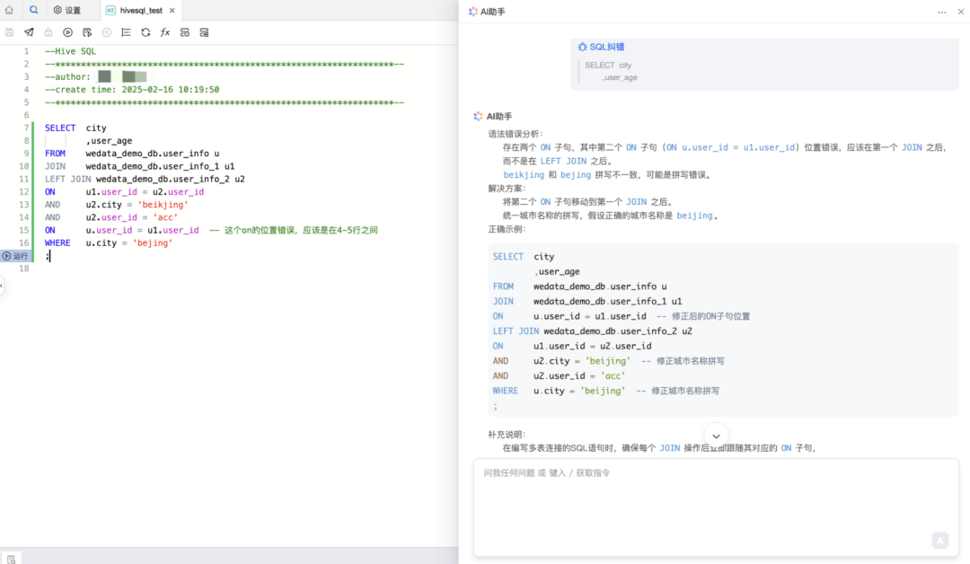 WeData AI助手提供魔法棒、快捷键、多轮对话框等多种产品形态,内置场景化的提示词工程,覆盖SQL生成、SQL纠错、SQL解释、生成注释等多种智能化数据开发场景,协助提高代码编写的准确性和高效性。经内部评测,WeData AI助手在SQL纠错场景下的错误检测准确率可高达93.7%,修复成功率达88.4%,同时具有较低的平均修复延迟。