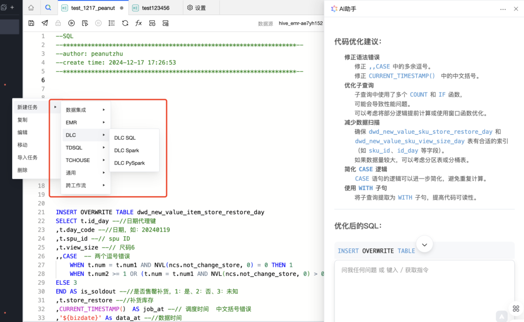 WeData AI助手覆盖腾讯云大数据EMR、DLC、TCHouse等多种引擎任务类型,灵活适配各类引擎语法,基于DeepSeek深度的自然语言理解和逻辑推理能力,准确地进行上下文理解和用户意图识别,可以结合代码执行分析提供更加深度的优化方案,联动推进引擎资源的弹性分配和成本治理。
