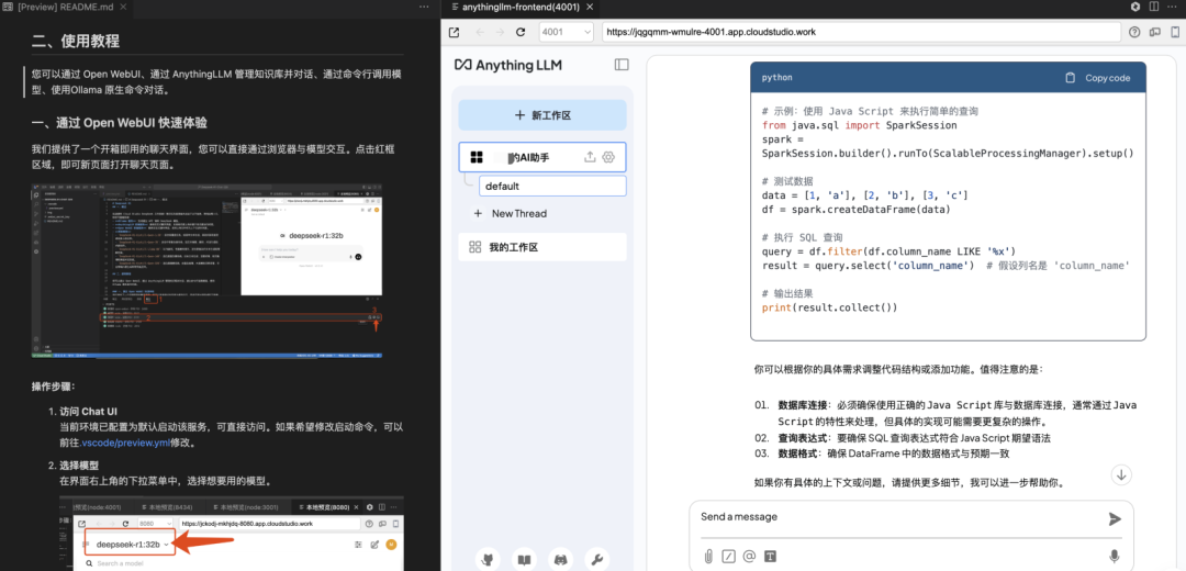 除内置的AI助手外,WeData还提供专属DeepSeek-R1大模型部署和AI助手的构建能力。您可以在WeData Notebook探索中一键创建DeepSeek工作空间,零代码、快速完成云端大模型部署,工作空间自带WebUI服务,支持开箱即用直接与大模型进行对话,同时可以上传本地知库进行检索增强生成(RAG),从而定义您专属的AI知识问答伙伴。