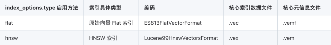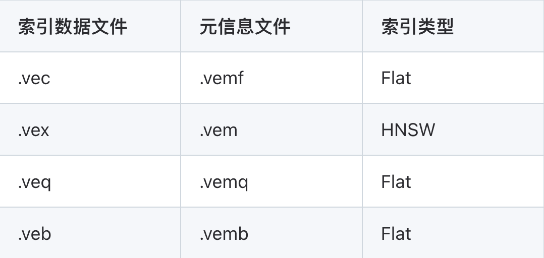 和 Lucene 以往的文件类型相似,引入新的索引一般会同时引入两种文件类型,向量索引继承了这一约定。