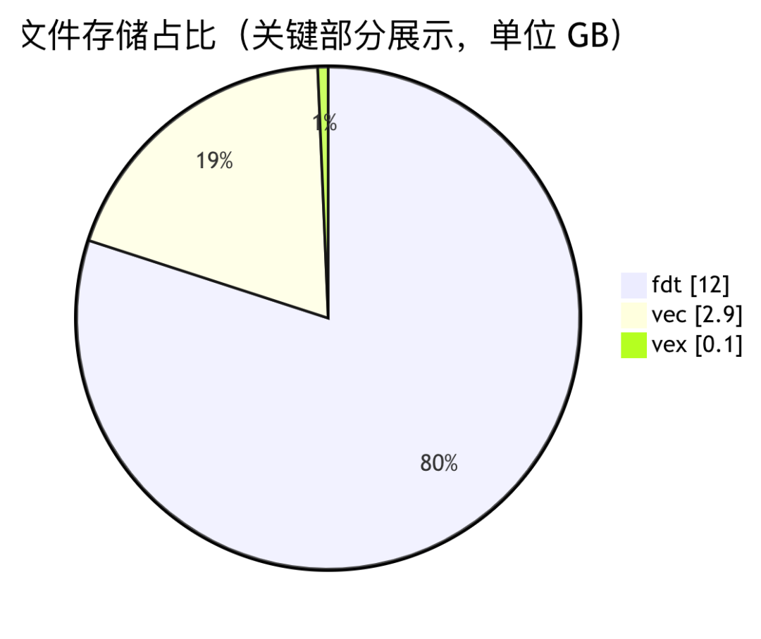 .fdt对于大量出现的向量数值仍然采用 json 字符串存储,缺少有效的压缩手段,较.dvd和.vec的存储高了不少
