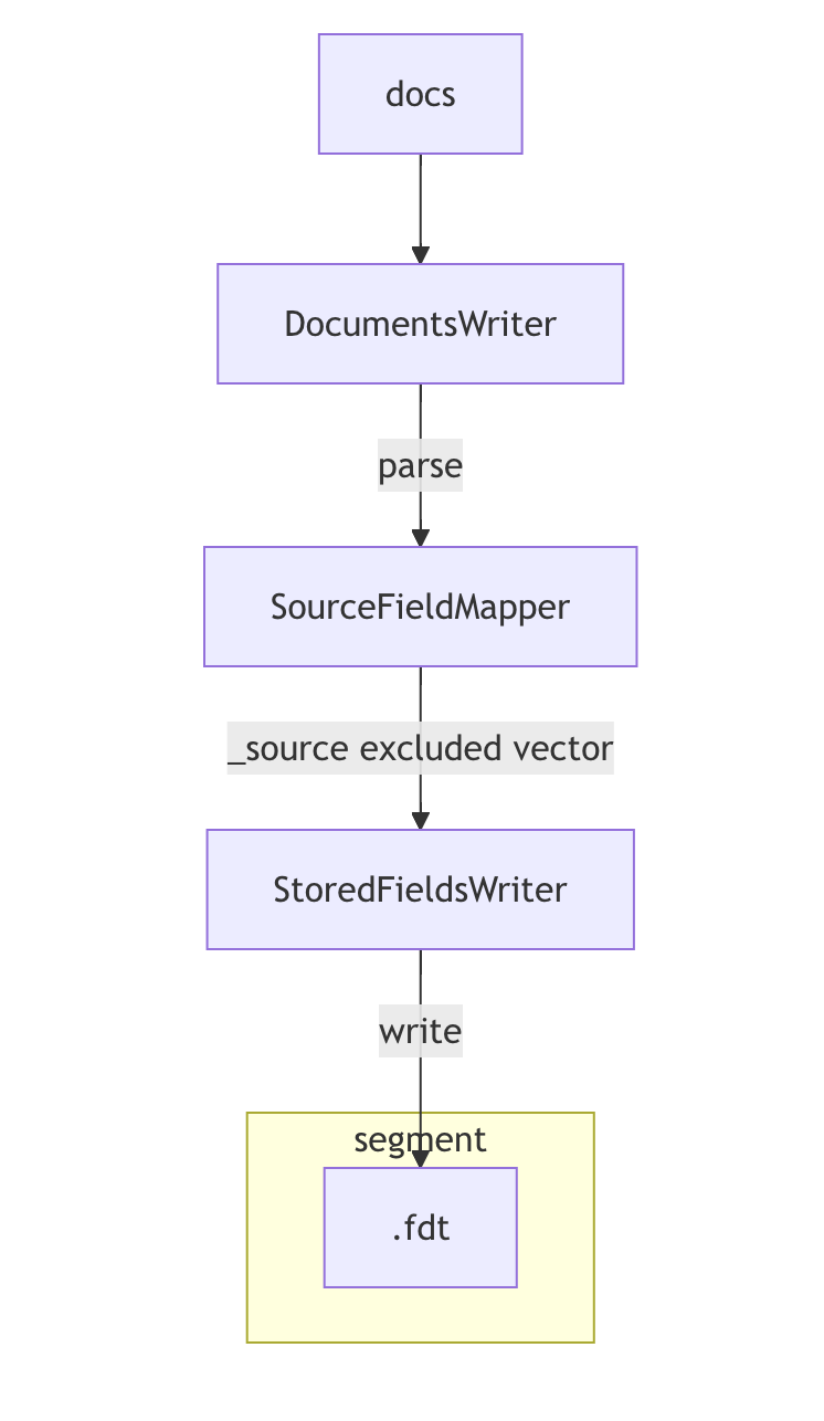 如此一来,列存中的向量数据可以直接获取,向量行存就没有存在意义了。腾讯云 ES 在自研的 v-pack 插件中,使SourceFieldMapper对 _source 中的dense_vector字段进行默认的裁剪,将上一章节中写入流程图的.fdt写入链路优化为如下流程。