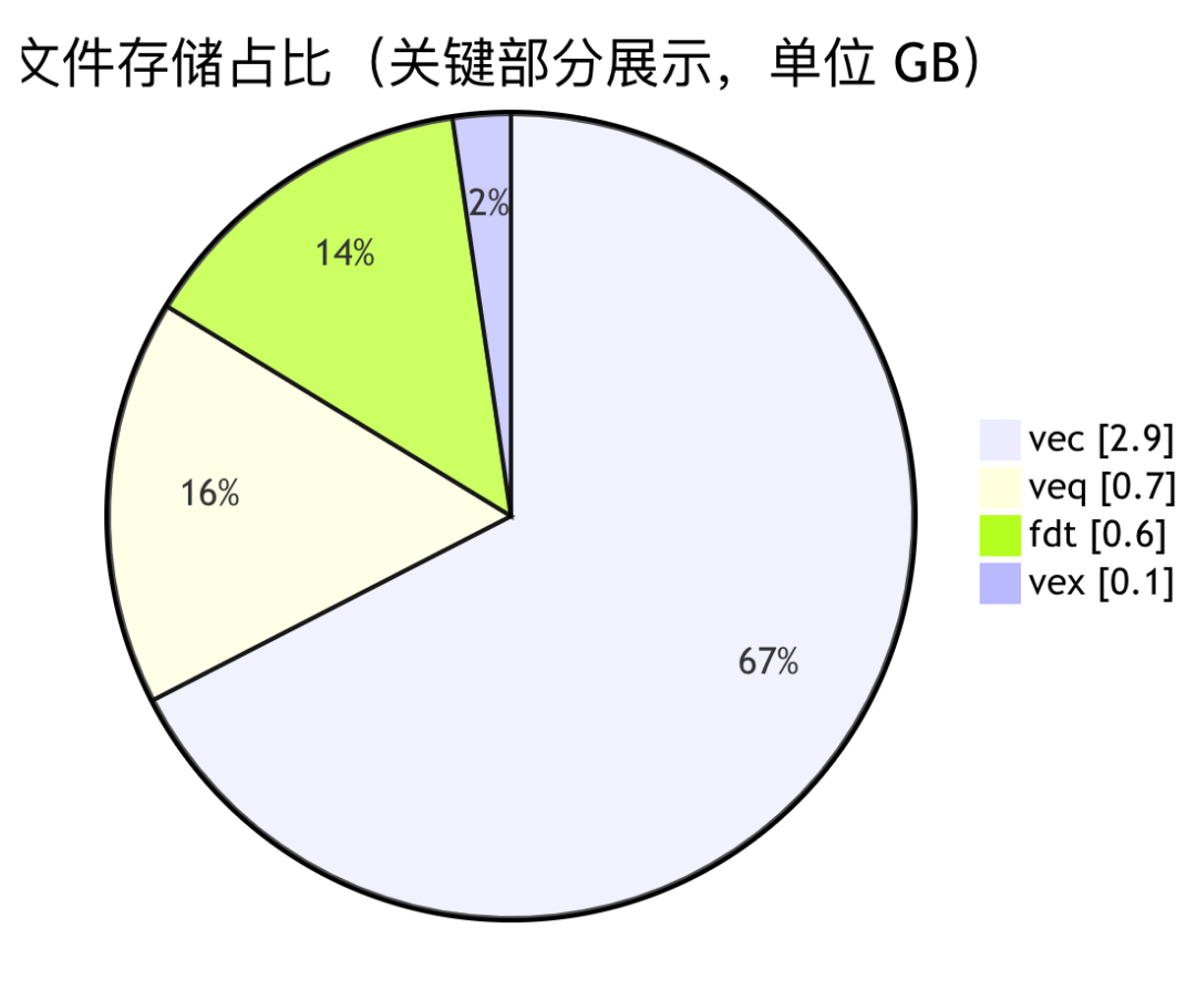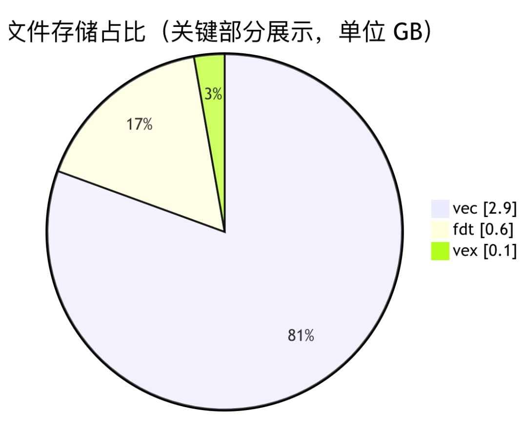 分片目录中,与“无索引”的配置相比,头部文件的大小未发生显著变化。.dvd文件大幅缩小到 26MB,.vec代替了.dvd,并且有趣的是同样为 2.9GB 的大小。在“无索引”的配置下,列存.dvd大部分存储由向量字段占据,在配置了向量字段的 Flat 索引后,该部分存储几乎 1:1 地转移到.vec类型的向量索引数据文件中。
