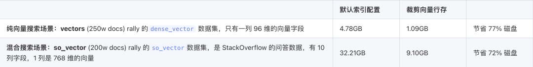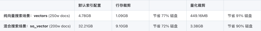 下面的表格概括了在纯向量搜索场景和混合搜索场景,该功能的最终效果,对于存储的节省均达到了 90% 以上。