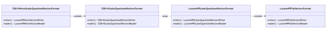 与”HNSW 索引“类似,源码中也存在一个内部 Flat 编码ES814ScalarQuantizedVectorsFormat。但由于量化的引入,编码之间的关系变得更加复杂,笔者将源码中编码的关系进行类图展示: