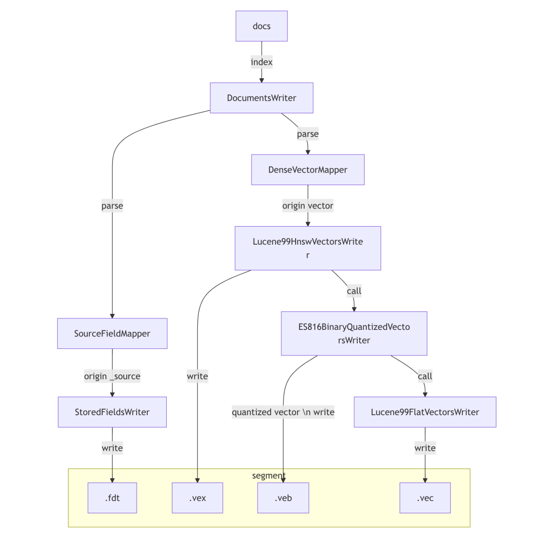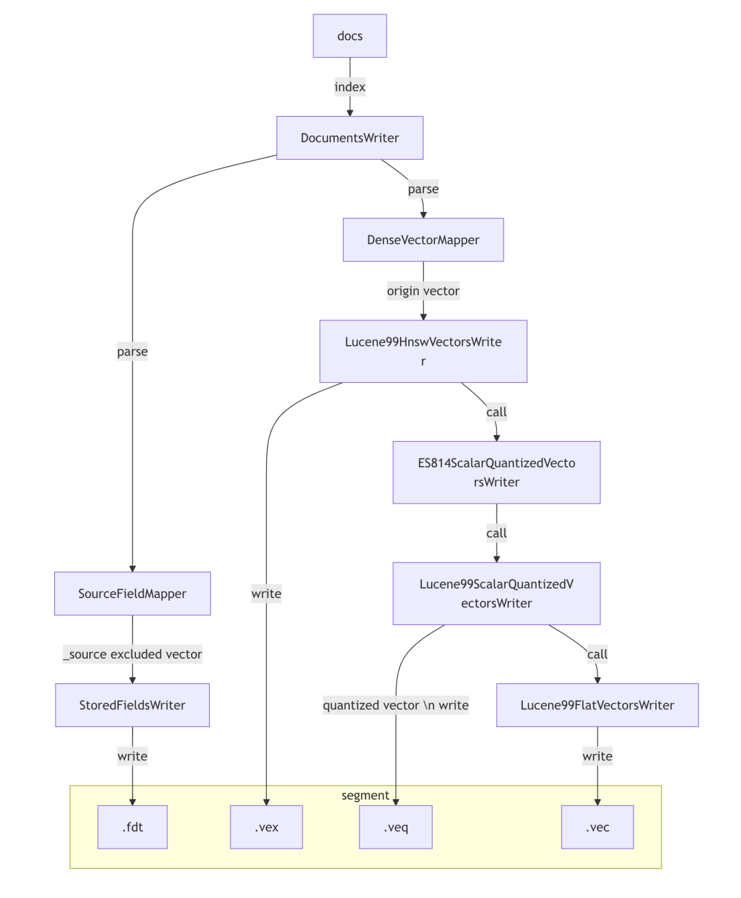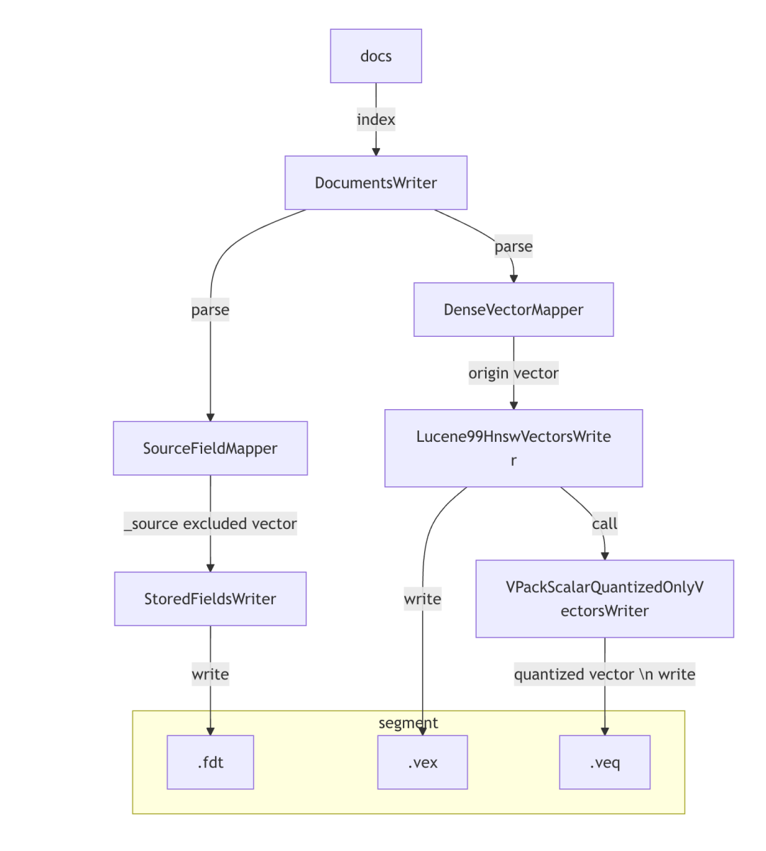 同样将源码中关键链路简化为流程图。可以看到在Lucene99ScalarQuantizedVectorsWriter这一关键链路中,写入动作伴随着量化,生成了新的.veq文件类型。