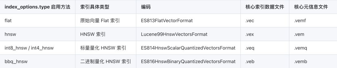 在上述配置的作用下,产生了.vec和.vemf文件,结合上一节的分析,我们知道它们分别是 Flat 索引的 data 文件和 metadata 文件。此外,_1m_ES813FlatVectorFormat_0.vec,按 Lucene 的规范,中间的ES813FlatVectorFormat实际是编码名,这里我们留个印象。