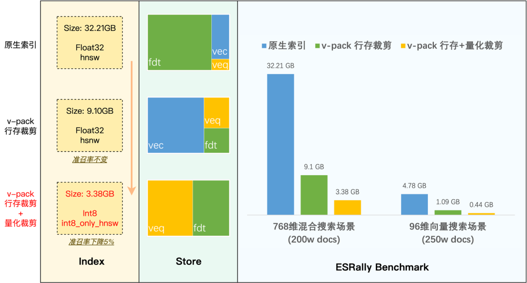 **腾讯云 ES 自发完成了该功能实现,并且在腾讯云 ES 新发布的 ES 8.16.1 版本上,集成在了腾讯云自研的 v-pack 向量增强插件中。通过字段 mapping 配置中指定"index_options.type": "int8_only_hnsw"来启用,即可以直接使用到降低 90% 存储的优化特性。**不同于行存裁剪,量化裁剪对召回率有微弱的影响,用户可以自行判断是否启用。虽然该功能相对实验性,但它进一步降低了 ES 向量搜索的存储门槛,拓展了不同读写流程。后续我们仅需要对”复水“算法进行优化,即可不断弱化这一影响,从而使其得到更广泛的使用。
