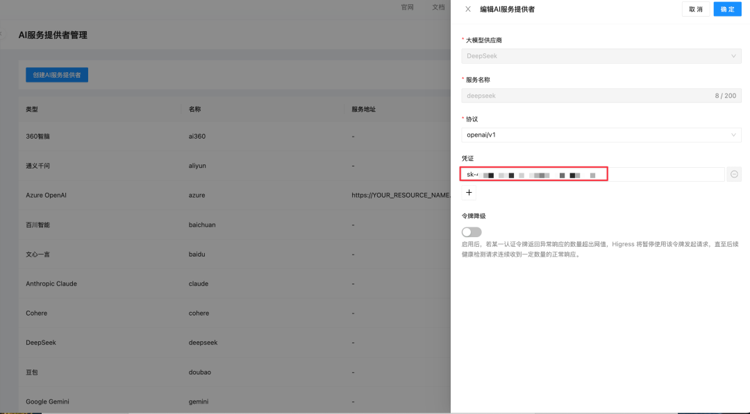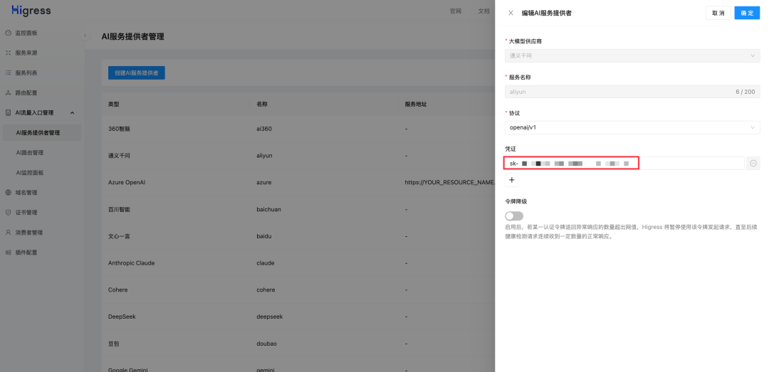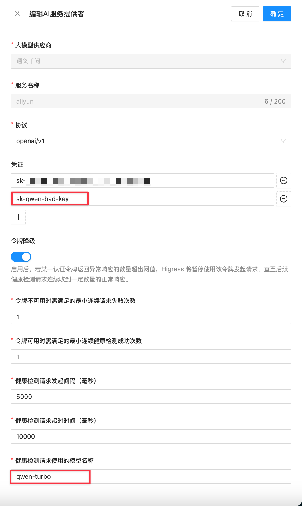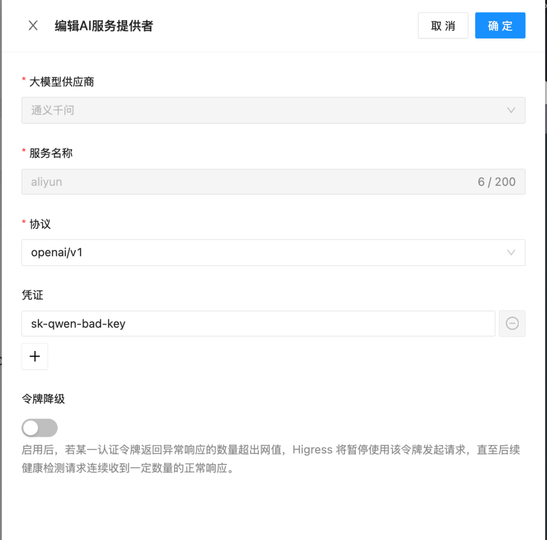界面中,编辑通义千问的凭证(ApiToken),这里我们故意设置一个错误的凭证,以确保能够触发降级功能。