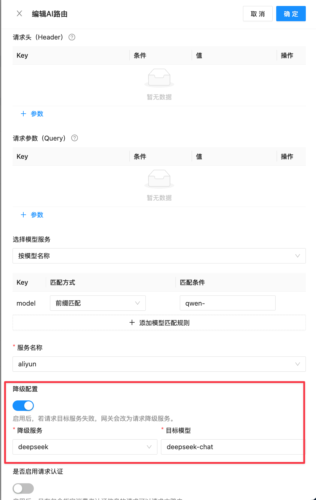 中,选择通义千问预设的 AI 路由(aliyun),并启用降级配置。在降级服务选项中选择 deepseek