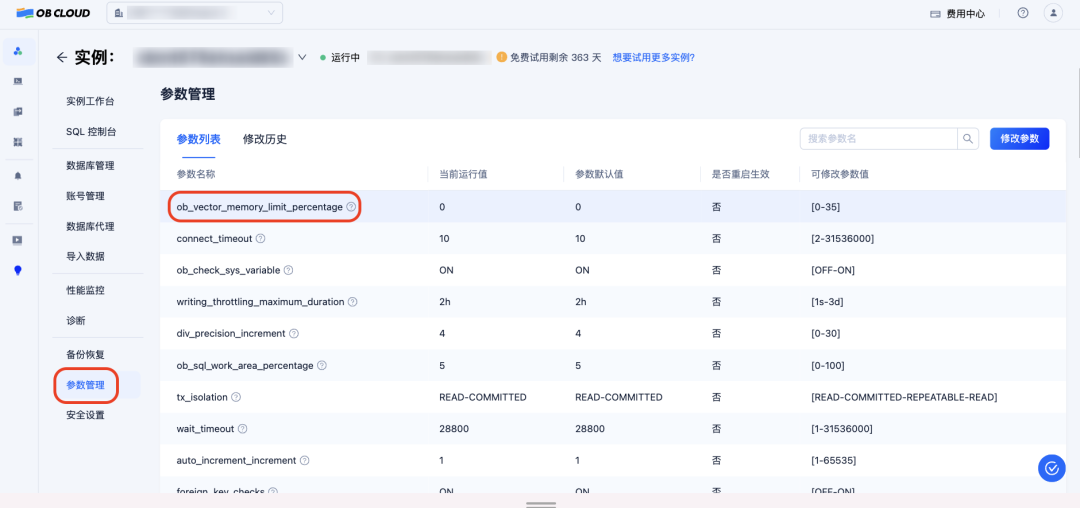 进入实例详情页的“参数管理”,将 ob_vector_memory_limit_percentage 参数修改为 30 以启动向量模块。