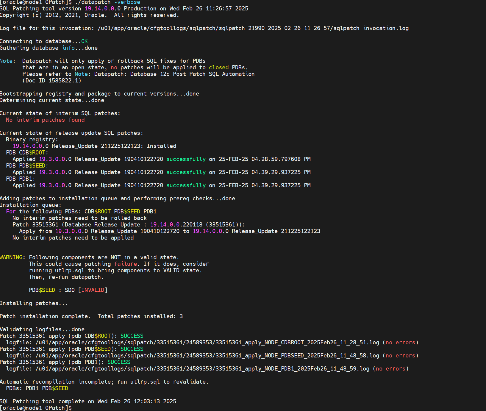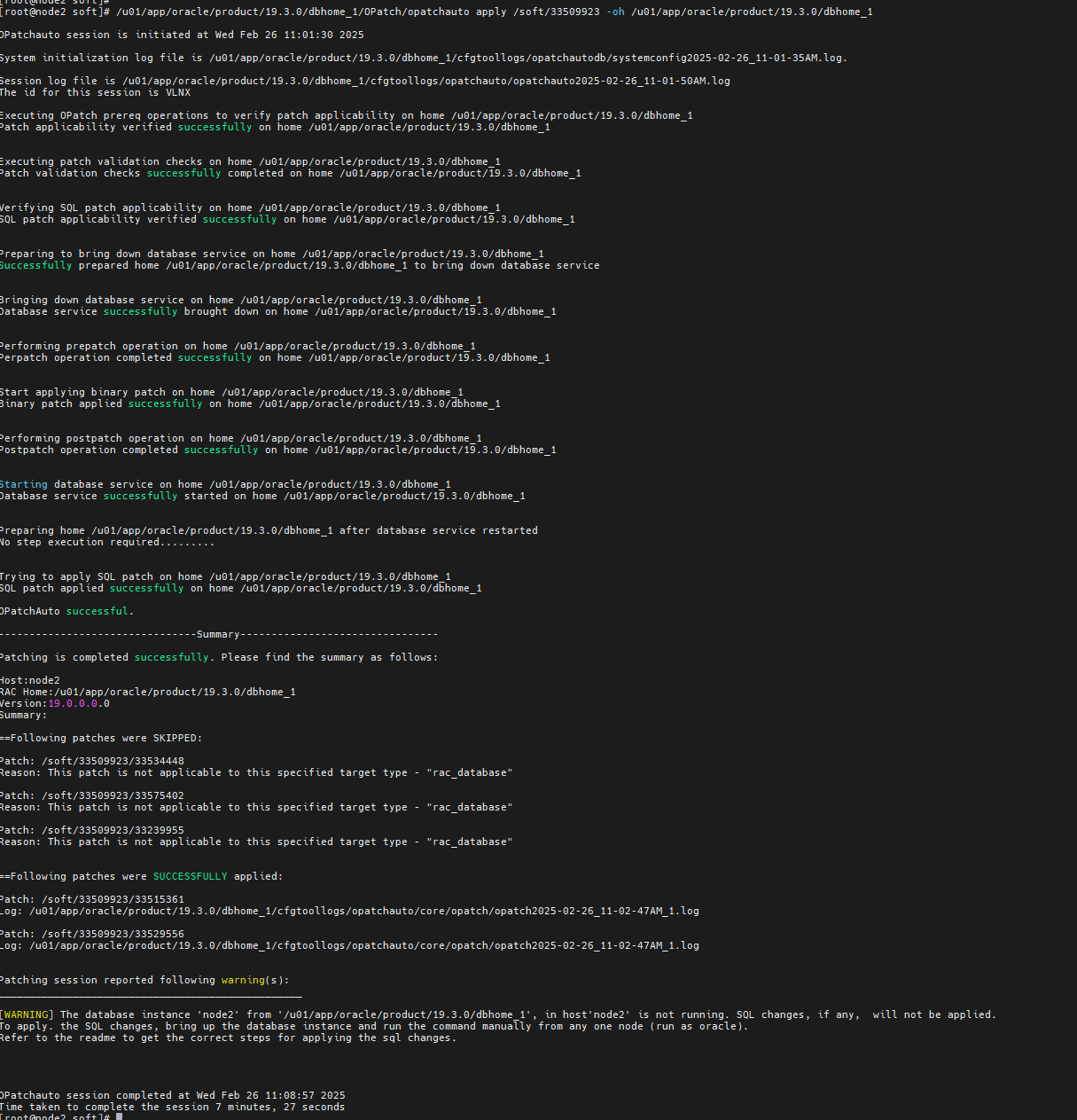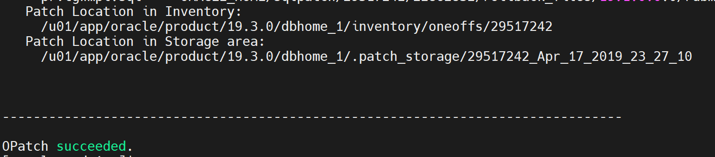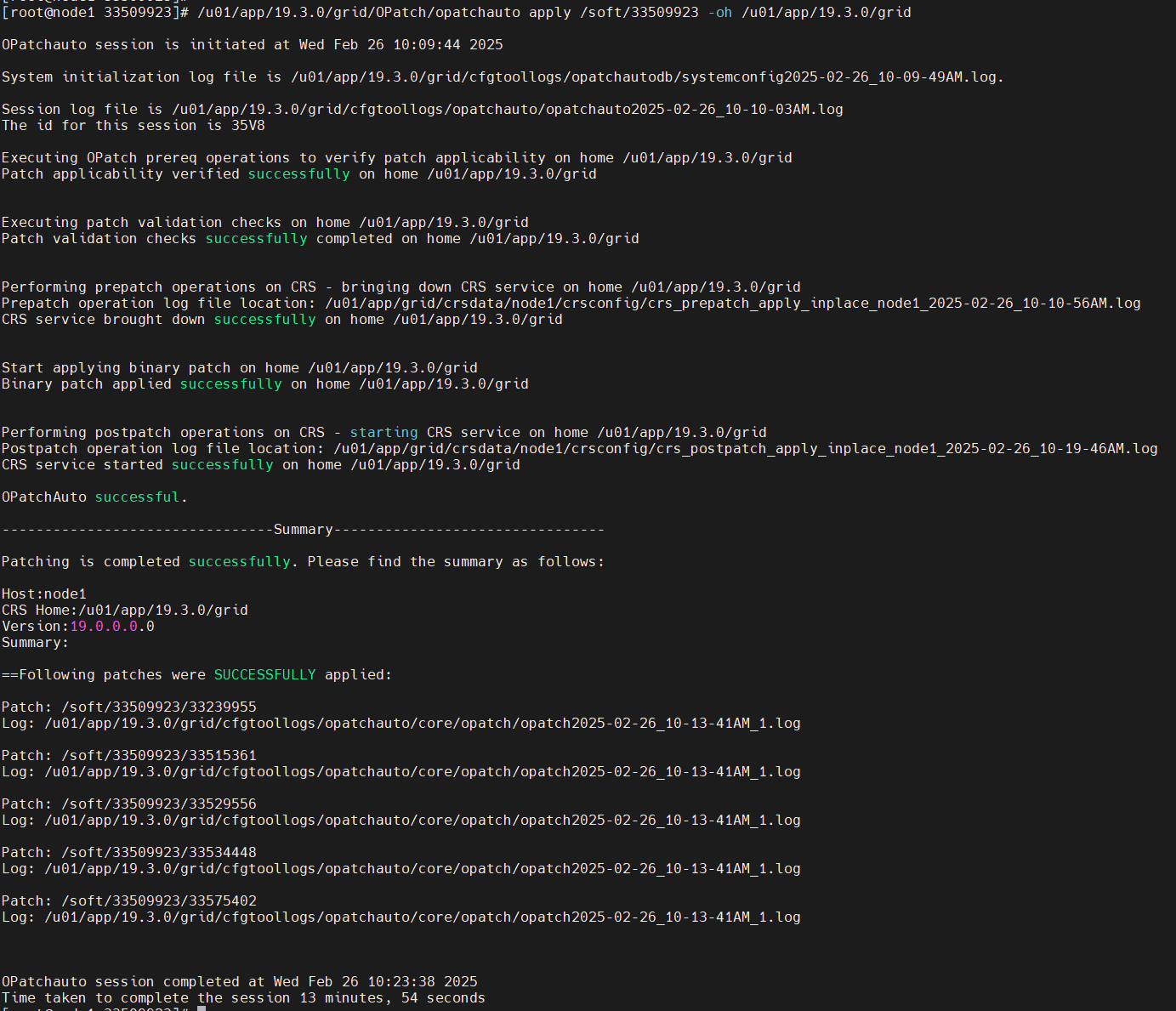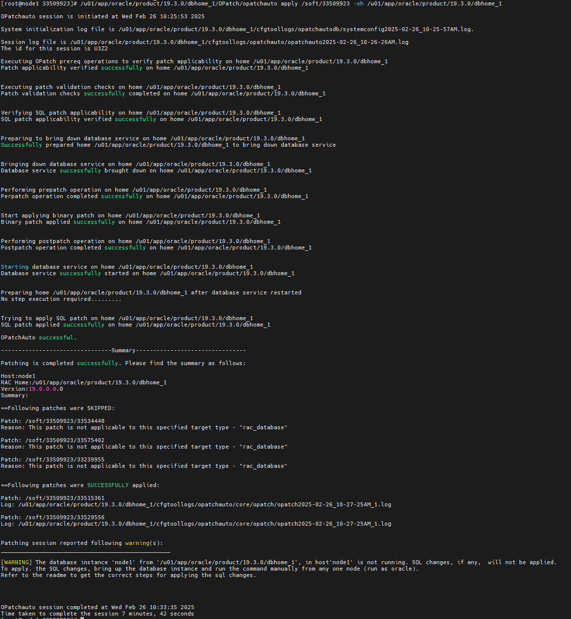/u01/app/oracle/product/19.3.0/dbhome_1/OPatch/opatchauto apply /soft/33509923 -oh /u01/app/oracle/product/19.3.0/dbhome_1