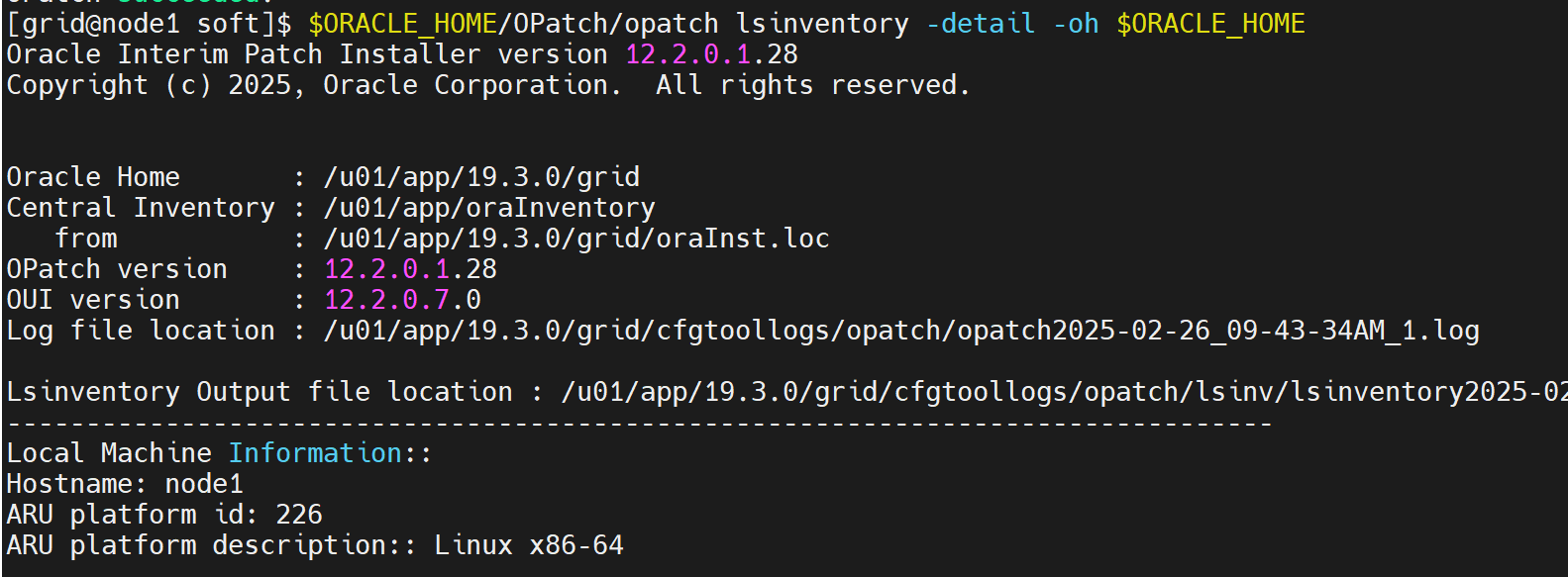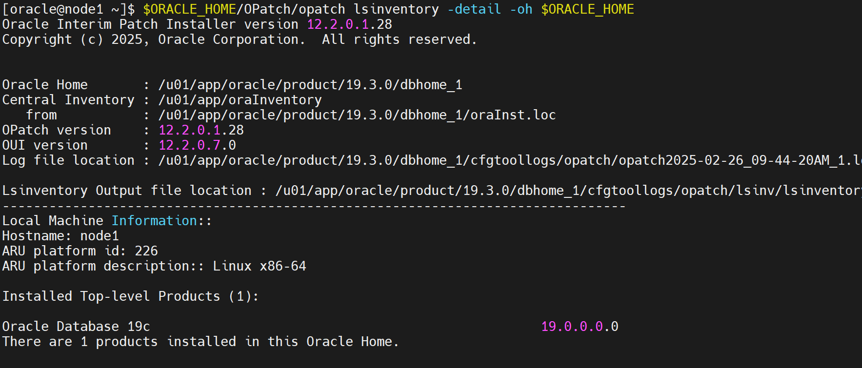 $ORACLE_HOME/OPatch/opatch lsinventory -detail -oh $ORACLE_HOME