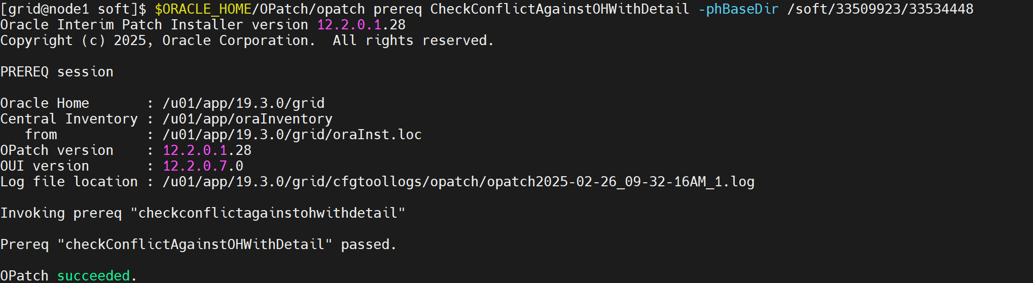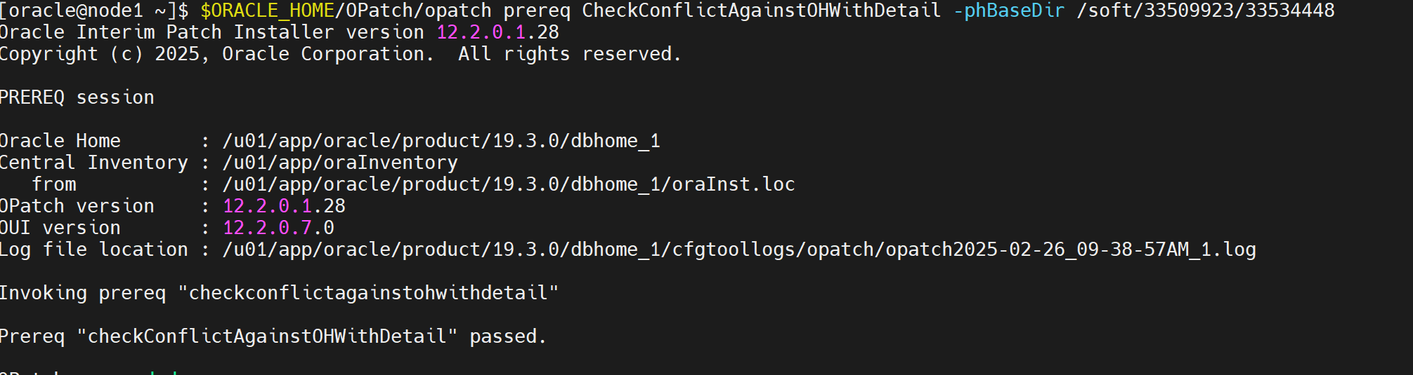 su - oracle$ORACLE_HOME/OPatch/opatch prereq CheckConflictAgainstOHWithDetail -phBaseDir /soft/33509923/33239955