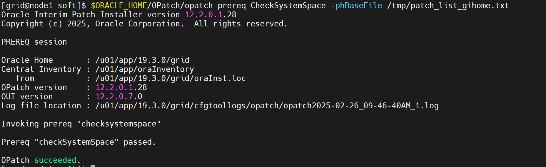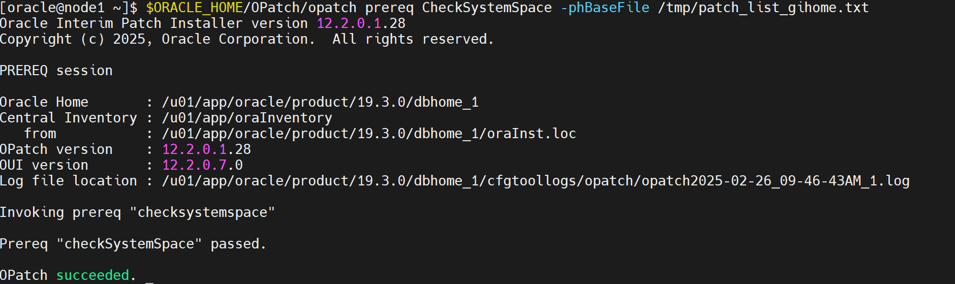 $ORACLE_HOME/OPatch/opatch prereq CheckSystemSpace -phBaseFile /tmp/patch_list_gihome.txt