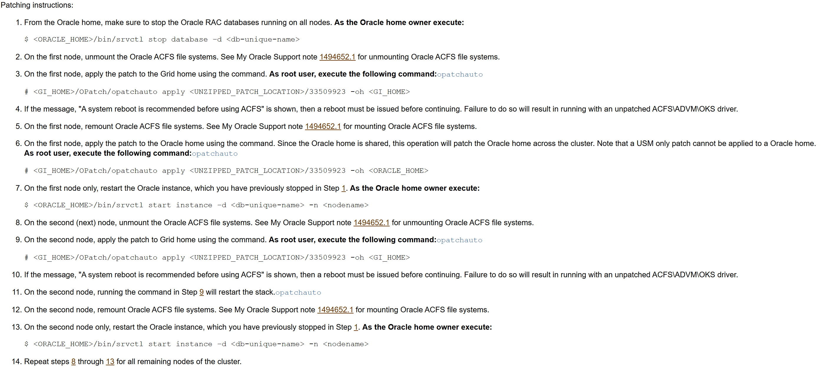 集群环境为oracle19c RAC,共享存储采用openfiler配置asm磁盘,打p33509923补丁是因为手上只有这个补丁包,本篇文档详细记录下19c RAC 测试环境下补丁应用过程及问题记录。以下为p33509923补丁操作部分说明截图