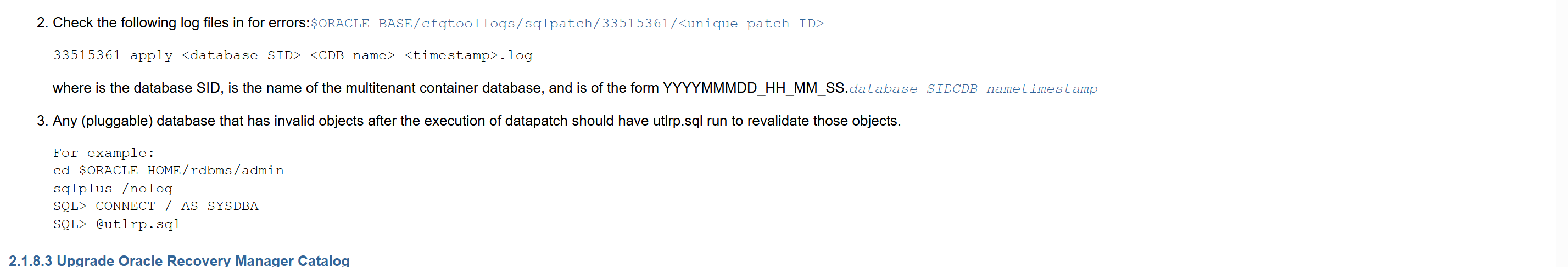 根据补丁文档说明对补丁应用后的数据库执行数据字典更新