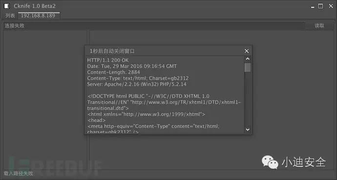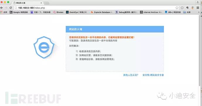 在开始使用修改配置法过狗前要知道安全狗拦截了什么,先做一个简单科普:安全狗拦截菜刀连接的过程有两步,第一步为服务端本身(即你的一句话木马)被特征库匹配为木马不允许执行,第二步为在数据包传递的过程中含有敏感的关键词被特征库匹配而不允许连接。如下图。
