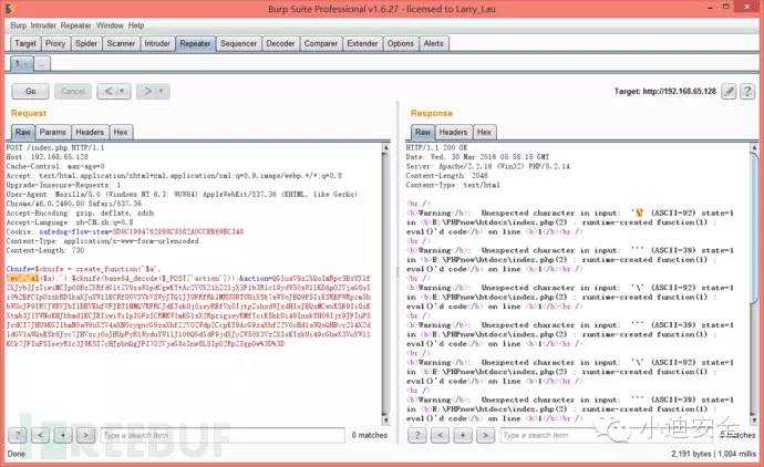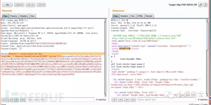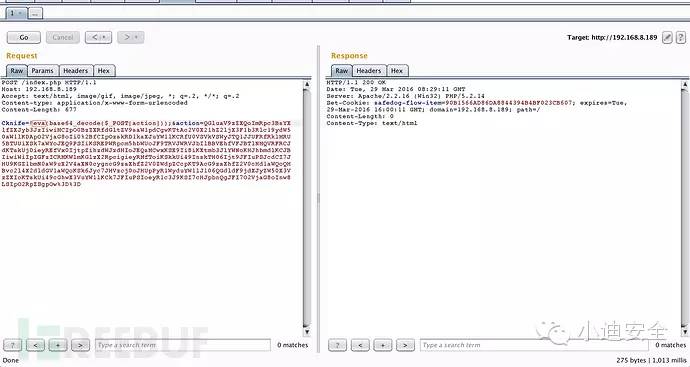 通过排除法(即删除你觉得可能被查杀的部分,反复提交数据包)确定只过滤了eval这个关键词。如下两图,分别为删除base64_decode中的某个字母依然被拦截,以及删除eval中的某个字母没有拦截。说明只是拦截了eval这个关键词。