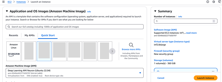 Deep Learning AMI Neuron:(Ubuntu 22.04)作为您的AMI,如下图所示。