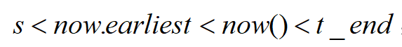 在选择 s 后,调用 TT.after(s),返回 true 后提交事务。TT.after(s) == true 因为 s < now().latest(备注:TT.after(s) 是 now() 的包装函数),而 now() 的实际调用时间一定大于 now.eariest,小于 t_end,从而得到: