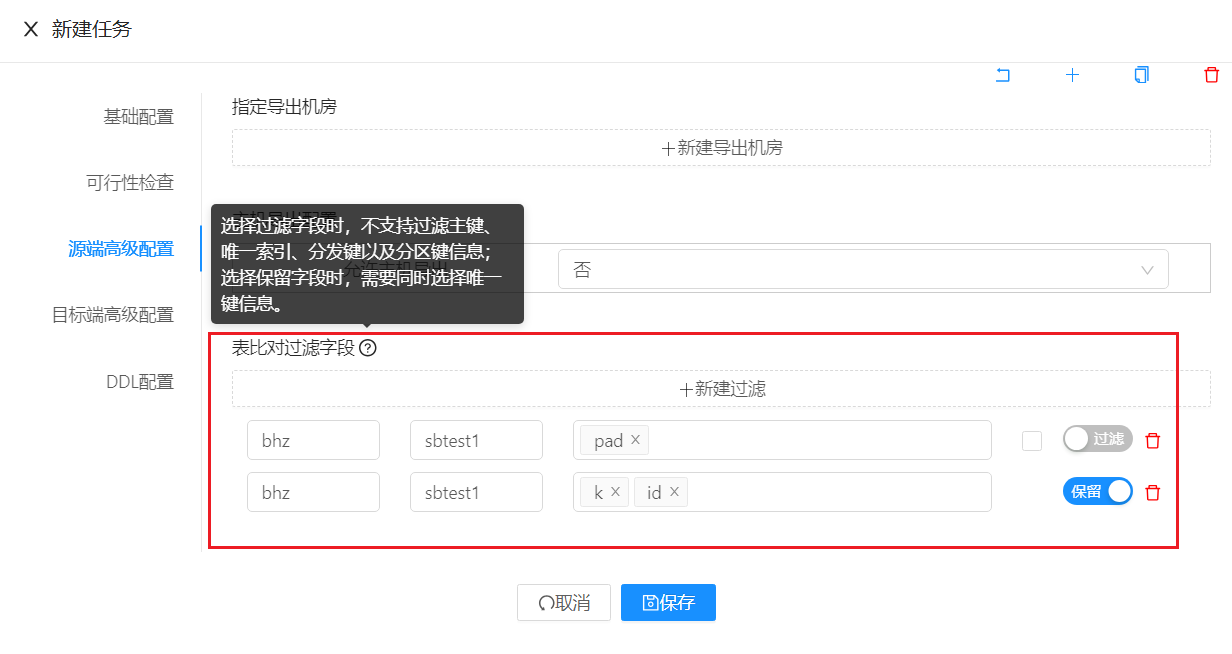 点击 源端高级配置 ,可以配置表比对过滤字段和保留字段。选择过滤字段时,不支持过滤主键、唯一索引、分发键以及分区键信息;选择保留字段时,需要同时选择唯一键信息。