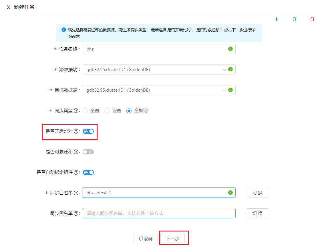 新建同步任务时,任务配置阶段可以选择 开启比对 功能,如下图所示。填写完必填信息后点击 下一步 。