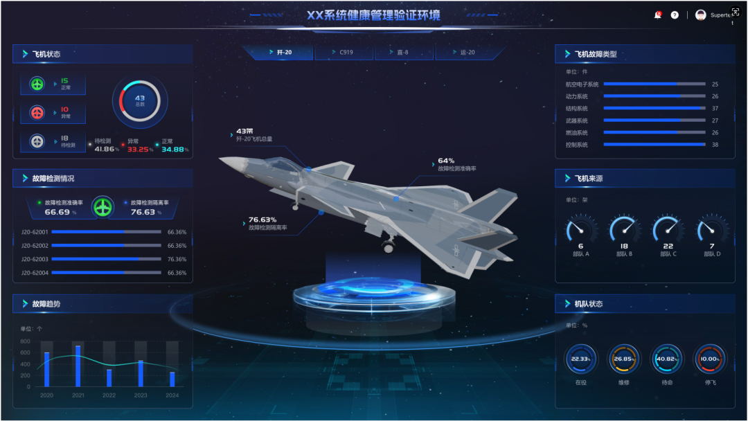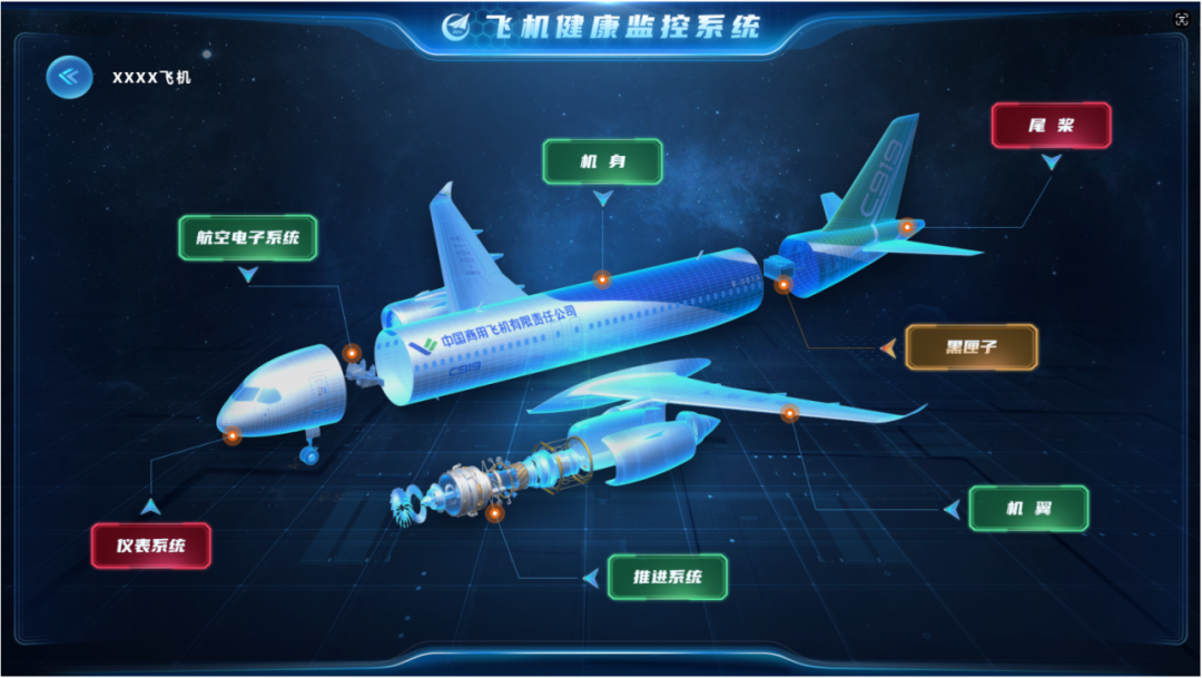 清晰展示飞机健康管理系统架构视图和功能视图,对多种机型进行统计,直观呈现不同机型中正常、维修、故障飞机的数量。这有助于快速掌握机队整体健康状况,及时调配资源,合理安排维护计划。