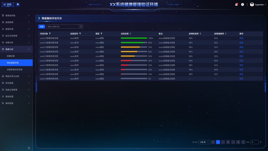 预设指标评估列表详细记录各验证任务的评估信息,包括评估对象、设备型号、模型、当前进度、故障检查率和故障隔离率等,能精准定位故障,为维修提供有力支持。