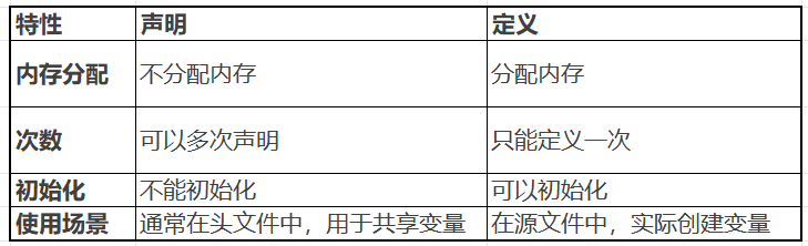 extern关键字)。通常用于头文件中,以便多个源文件共享变量。