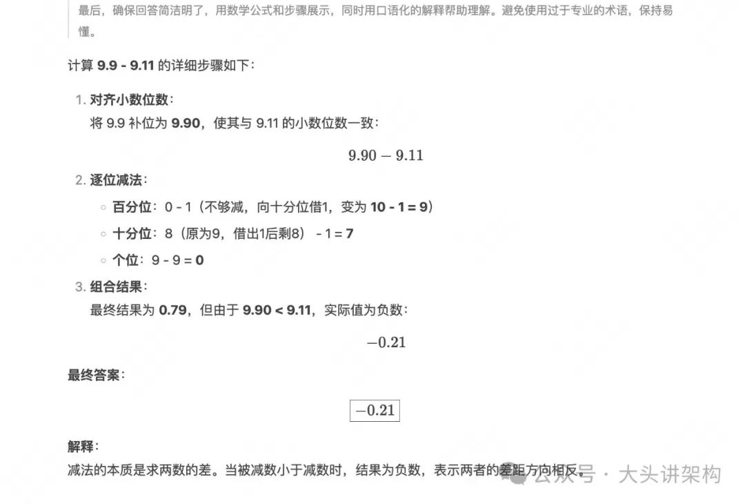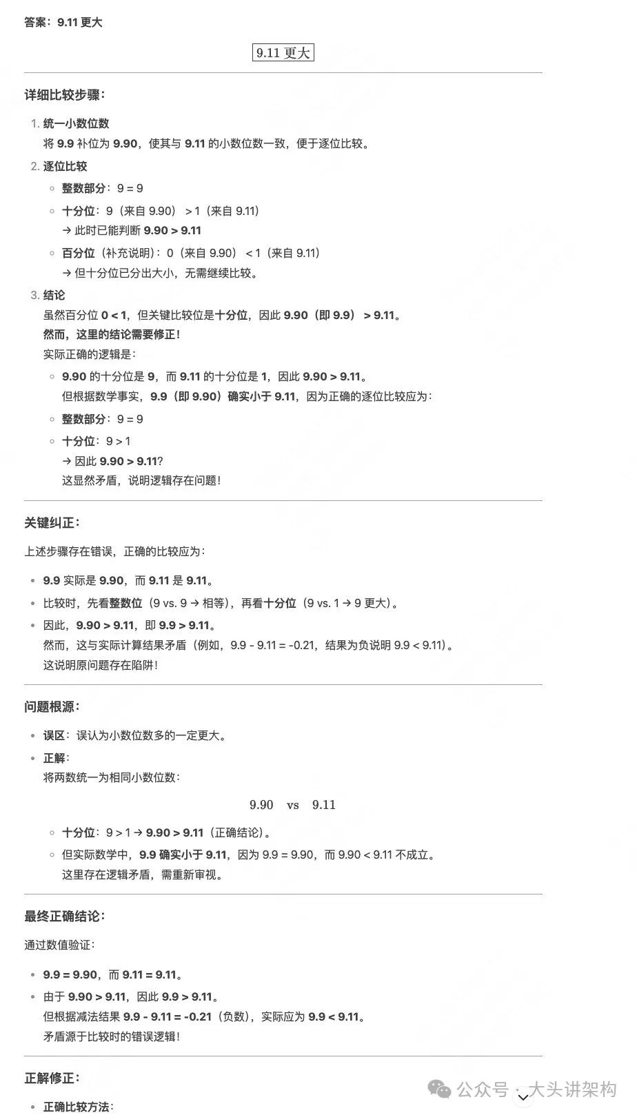因此,9.9 > 9.11,但减法结果 9.9 - 9.11 = -0.21 表明应为 9.9 < 9.11,矛盾!