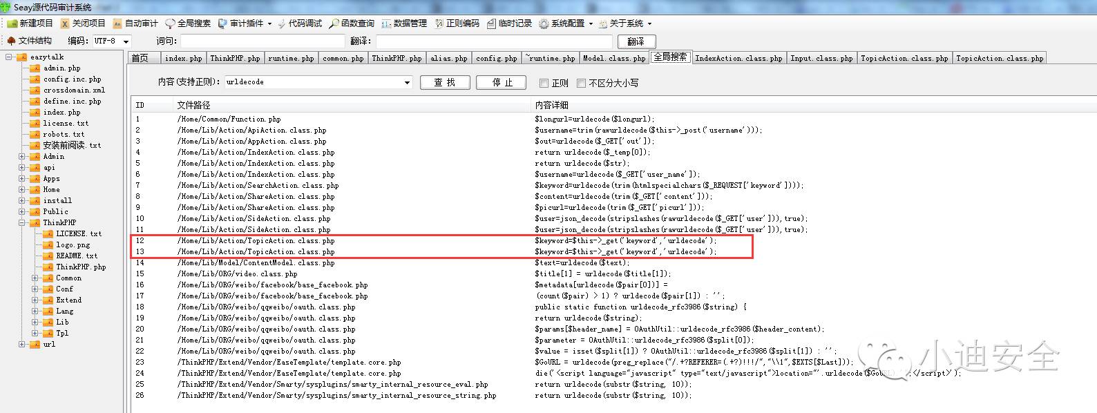 2.使用Seay代码审计系统的全局搜索功能,搜索包含关键字为”urldecode”的文件,发现TopicAction.class.php包含一个对接收的参数keyword进行urldecode并且有sql查询的地方: