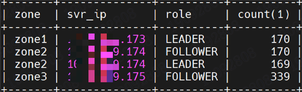 根据返回结果可知,无论表是否分区,其 LEADER 都只在 zone1、zone2,在 zone3 上全是 FOLLOWER。