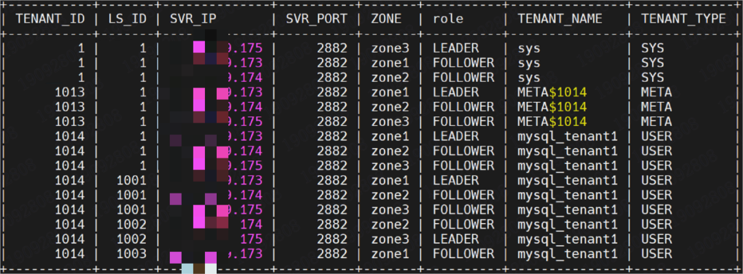 SELECT a.TENANT_ID,a.LS_ID,a.SVR_IP,a.SVR_PORT,a.ZONE,a.role,b.TENANT_NAME,b.TENANT_TYPE FROM oceanbase.CDB_OB_LS_LOCATIONS a, oceanbase.DBA_OB_TENANTS b WHERE a.TENANT_ID=b.TENANT_ID;
