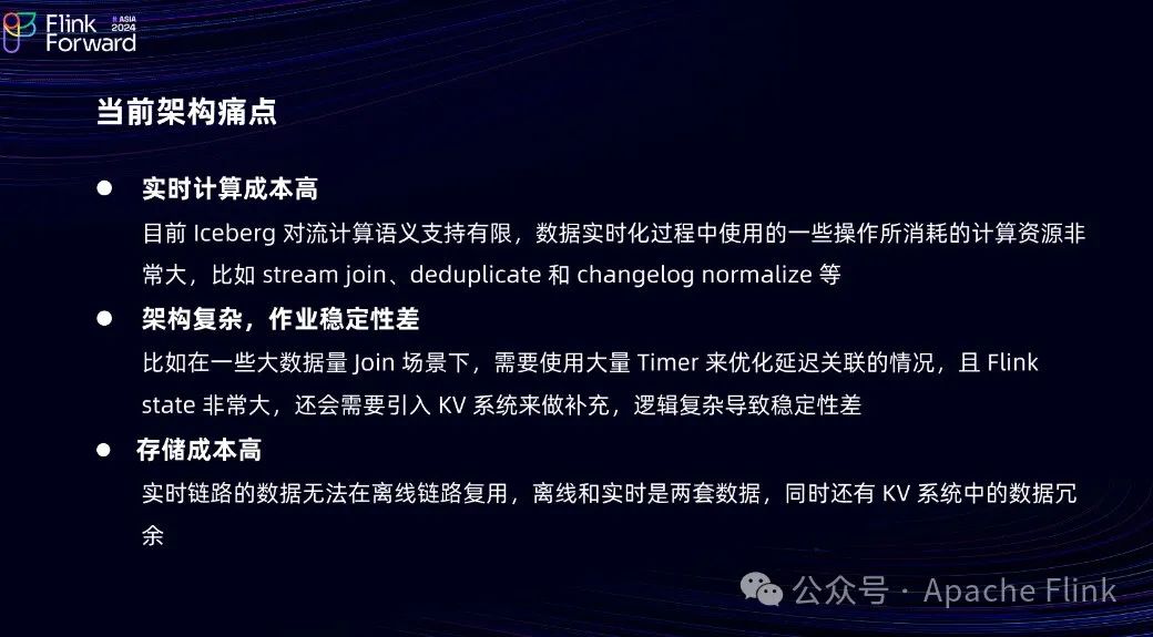 (2)架构复杂,作业稳定性差:在进行实时化处理时,整个作业架构较为复杂,稳定性较差。从之前的图中可以看到,除了实时数仓中的 Iceberg 和消息队列外,还会根据需求引入外部的 KV 系统。这部分 KV 系统会增加用户的运维成本,并且使用不便,无法直接通过 OLAP 引擎查询。
