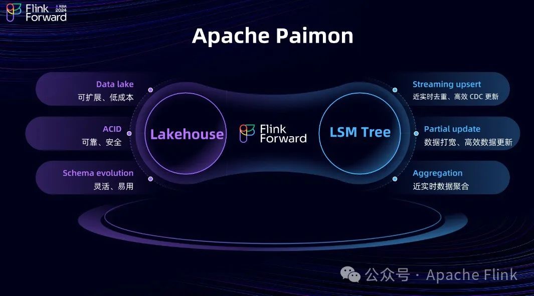 (2) LSM 存储结构:在 Lake House 架构的基础上,Paimon 创新性地引入了 LSM(Log-Structured Merge-Tree)存储结构,带来了以下三个主要能力: