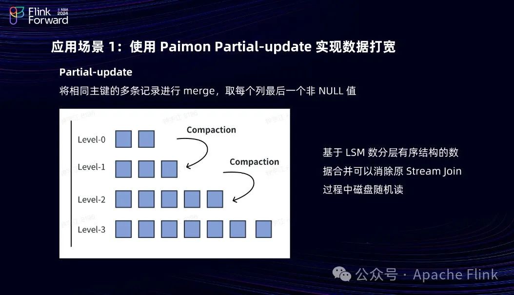 为了解决上述问题,可以利用 Paimon 的部分列更新功能。Paimon 支持一种名为 Partial-Update 的 Merge 引擎。这个功能能够对相同主键的多条记录进行合并,取每个列的最后一个非空值。然而,这种 Merge 操作并不是在 Flink 的计算任务中完成的,而是在 Paimon 表的 Compaction 任务中进行的。由于 Paimon 的存储采用 LSM(Log-Structured Merge-Tree)分层有序的数据结构,在进行 Compaction 时,能够轻松地将不同层的相同记录合并。