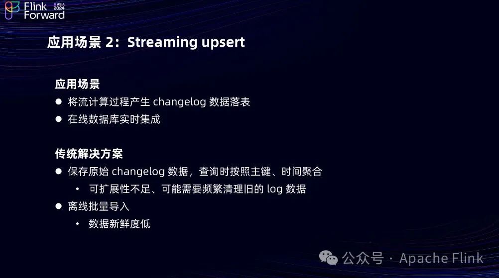 第二个应用场景是 Paimon 的 Streaming Upsert 功能,主要应用于两个方面:首先是在流计算过程中产生的 Changelog 数据被写入 Paimon 表;其次是通过 CDC 技术将在线数据库的增量更新数据集成到 Paimon 表中。